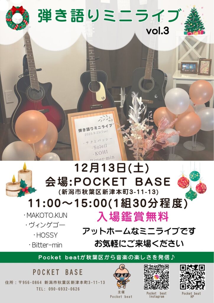 🎸Pocket beat 弾き語りミニライブ vol.3 のお知らせ🎄