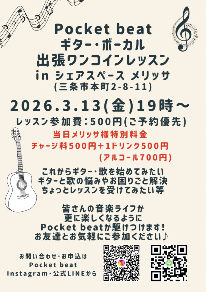 📅 日時:2026年3月13日(金)19:00〜 📍 場所:シェアスペース メリッサ (三条市本町2-8-11) 💰 参加費:レッスン代 500円 ※別途、当日特別料金(チャージ500円+1ドリンク代)が必要となります。