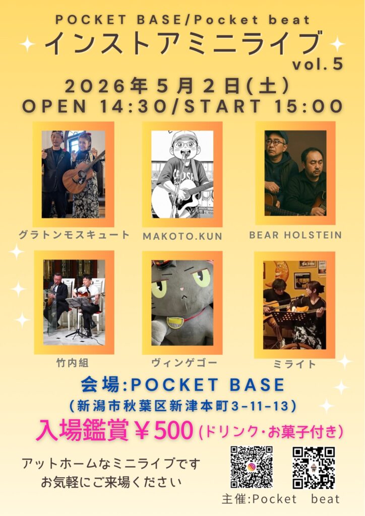 新津本町のPOCKET BASEにて、第5回目となる『インストアミニライブ』をお届けします!